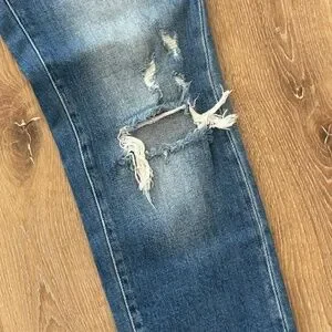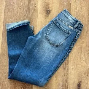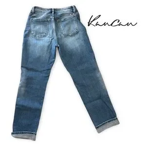 KanCan is a brand specializing in women's jeans and denim, known for styles like high-rise, distressed, skinny, mom, and bootcut jeans. The jeans in the image are consistent with KanCan's style, featuring a high-rise fit and distressed knees, which are prominent features in many of their popular models like the Trixie High Rise Distressed Skinny Jeans or the Jinny High Rise Mom Jeans.