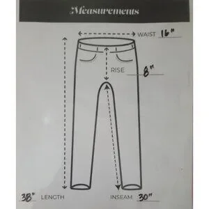 Measurements (laying flat): Waist = 16 inches, Inseam = 30 inches, Rise = 8 inches, Leg Opening = 8.5 inches