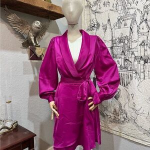 Experience the luxurious feel of this Vince Camuto wrap dress, crafted in a stunning pink satin. The wrap-style closure and shawl collar add a touch of elegance, while the tie belt ensures a perfect fit. Ideal for lounging in style, this robe combines comfort with a sophisticated design! New with tag and from a smoke free home.