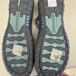 Stylish Skechers Reggae Soundstage Thong Black Slide Sandals with a strappy design. Features black and light blue accents. Ideal for everyday comfort. NWOT, stickers still intact on bottom. Women’s size 8