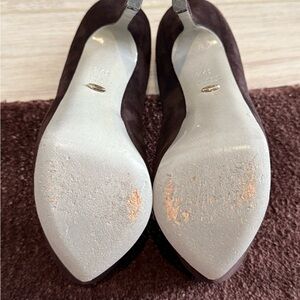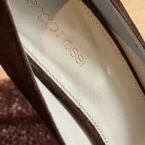 Gorgeous Sergio Rossi dark chocolate brown suede peep toe platform heels. Some minor scuffing on left heel and minor wear on soles, but in overall excellent condition. Please see all photos.