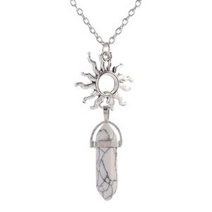 Elegant silver sun necklace featuring a howlite crystal hexagon pillar pendant. Perfect for adding a sense of magic and calmness to any outfit or aura