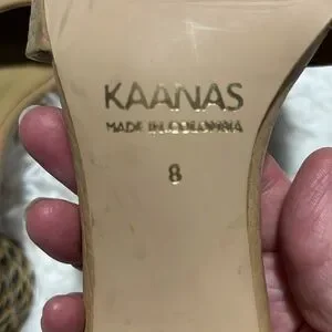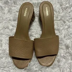Kaanas Tobago tan leather slides, sandals, size 8. These have about a 3” braid wrapped heel in excellent pre-owned condition, super cute!!