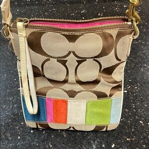 This Coach crossbody bag features a vibrant multicolor design, perfect for adding a pop of color to any outfit. Its compact size and adjustable strap make it ideal for everyday use.