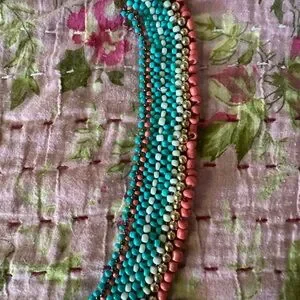 This vibrant multicolor beaded necklace is a stunning addition to any jewelry collection. Featuring a beautiful blend of turquoise, coral, and cream beads, it adds a pop of color to any outfit. Perfect for casual or formal occasions. Really lovely I took it to Mexico once for a girls trip and it was a big hit !