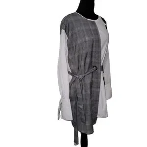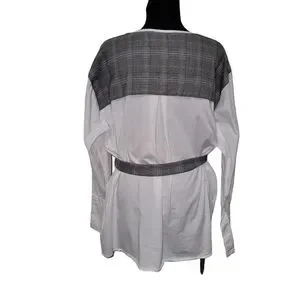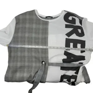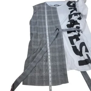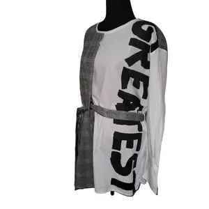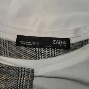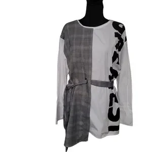 This Zara blouse features a striking asymmetrical design with a blend of black and white elements. The long sleeves and unique tie front detail add a modern touch, while the graphic text and plaid pattern create a bold contrast. Perfect for making a statement, this top combines elegance with avant-garde style.