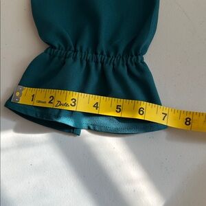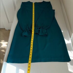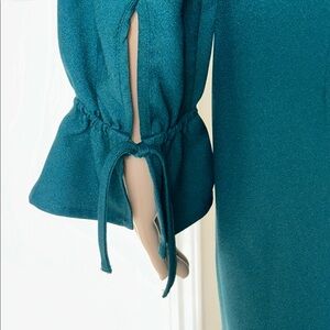 Chic teal dress with long sleeves and ruffle cuffs. Ideal for stylish occasions.