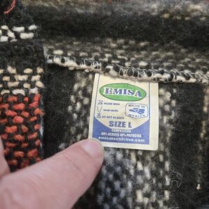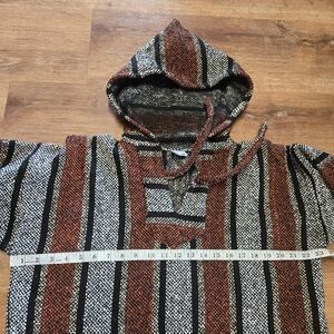 Cozy striped Baja hoodie with a front pocket. Features a mix of black, gray, and rust colors. Perfect for casual wear. hoodie is in excellent used condition, showing minimal signs of wear.