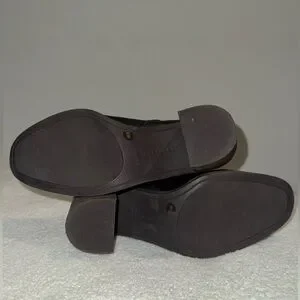Crafted from smooth black leather, these Lucky Brand ankle boots boast a classic design with a chunky stacked heel for added style and comfort. The rounded toe and sleek silhouette make them a versatile choice for any occasion, effortlessly blending with both casual and dressy outfits.