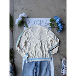 Brand new and unworn GOLF WANG track jacket. This cream-colored full-zip jacket features signature pastel blue and brown racing stripes down the sleeves and torso, with a standout embroidered “GOLF” logo and Saturn-style planet emblem on the chest. The jacket is made from a soft velour or terry-like material, giving it a cozy yet sporty vintage aesthetic. Ribbed cuffs and waistband in a light blue and white striped pattern add a clean, retro finish. Yellow GOLF tag on the collar confirms authenticity.