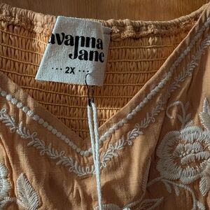 Elegant long sleeve dress with floral embroidery. Soft peach color. Perfect for any occasion. This was advertised as a scoop neck but I believe it is supposed to be worn off the shoulder.