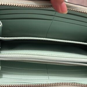 Elegant and stylish, this Coach handbag in mint green is perfect for any occasion. The delicate floral cutouts add a touch of sophistication.