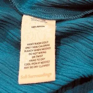 Crinkled rayon fabric. V neck. Long sleeves. A tier at the hem. Hand wash cold.