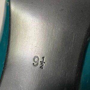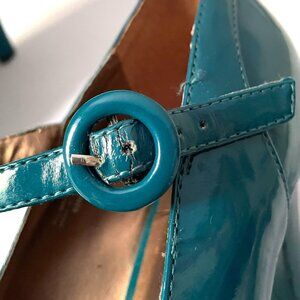 Elegant and chic Gabriella Rocha 'Shelby2' T-strap teal pumps crafted in glossy patent leather. Buckle closure. Chunky 3.5” heel. Like new rubber sole with excellent heel caps. Rounded toe for a super retro look. Cushioned insole for comfort. Size 9.5. GUC, minor wear as shown in photos. One heel has a little tear. Vamp, pinup, MCM, 50s vibes. Beautiful, funky and fun heels!