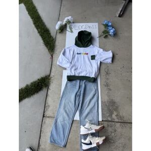 Up for grabs is an unworn Golf Wang hoodie featuring the vibrant rainbow "Golfwang" embroidery across the chest. This hoodie blends a clean white base with deep forest green contrast details on the hood, cuffs, and waistband. It’s a rare and colorful piece that perfectly captures the bold, playful spirit of Tyler, The Creator's Golf Wang brand.