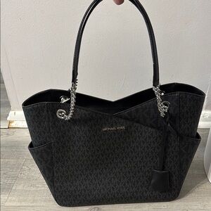 This luxurious Michael Kors tote features a sophisticated quilted design in classic black, enhanced by elegant silver-tone chain straps. Crafted with a structured silhouette, it offers both style and functionality, making it a versatile addition to any wardrobe.