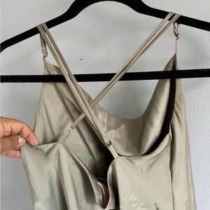 Chic olive green maxi dress with a draped neckline. Ideal for any occasion.
