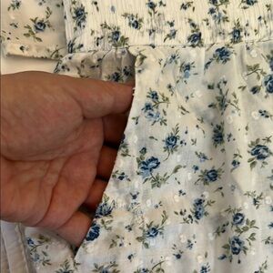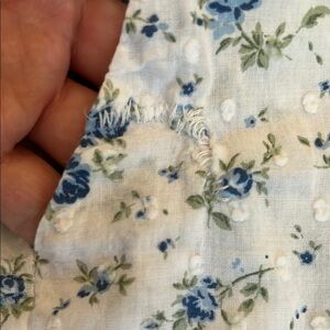 Charming short pajama set featuring small blue flowers on a white pattern. Perfect for a cozy days or nights. ⚠️PLEASE READ! Last pic clearly shows where I had to mend the cotton. I just purchased this and washed it before wearing, as is my habit. When I was taking it out of the wash I accidentally snagged it on the door. It was mended with cotton thread. THEREFORE THE REDUCED PRICE⚠️