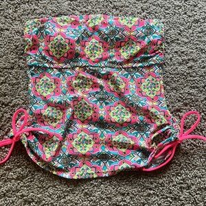 Arizona Jean Company Floral Tankini. Size Small. The 2 piece set includes a strapless top with side ties and a bikini bottom with open side accents. Contains removable pads. Corals and teals and yellow hues. Never worn. Smoke free home. Does not come with strap.