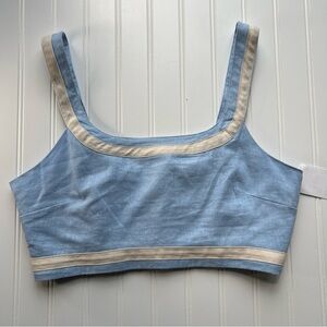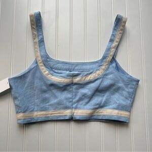 Creamy borders frame a breezy blue crop top cut from a lightweight, breathable linen blend.