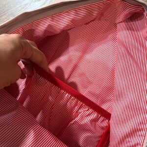 Top handle, full zip closure, striped lining, laptop sleeve