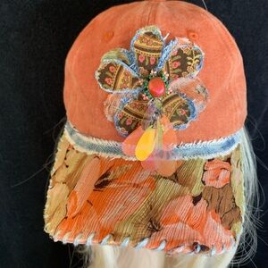 New hat with embellishments made from recycled or repurposed materials by me,Cathy