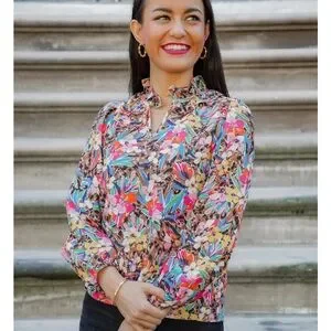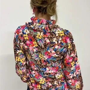 Elevate your style with this THML blouse, featuring a vibrant graphic print in pink and yellow. The long puff sleeves and ruffled details add a touch of elegance, while the mandarin collar offers a modern twist. Perfect for making a statement, this blouse combines comfort with a chic, structured fit.