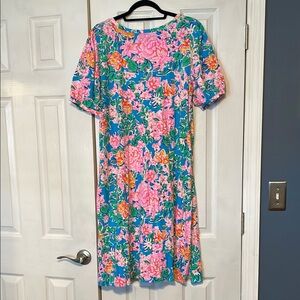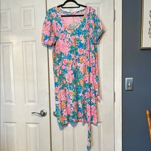 Embrace a breezy, resort-ready look with this Lilly Pulitzer sundress, showcasing a delightful pink and green floral color scheme. Designed with a V-neck neckline and short puff sleeves, this midi dress offers a perfect blend of style and comfort. Its flowy silhouette makes it an ideal choice for casual outings and sun-soaked adventures. Wear with or without matching wrap belt. Barely worn. Like new. No damage. Smoke free.