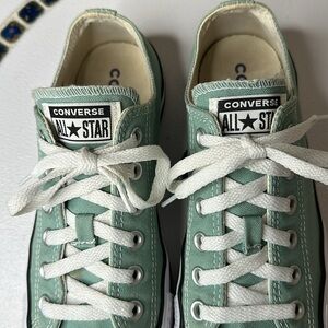 The Converse All Star Low Top Sneakers Shoes in mint green are a stylish and comfortable choice for both men and women. With a high top shoe shaft style and lace-up closure, these sneakers offer a classic look and secure fit. Made of durable canvas material with a cushioned outsole, they are perfect for walking, school, or skateboarding activities. The breathable design and solid green color make these Converse shoes a versatile addition to any wardrobe, combining fashion and function seamlessly. Pre-owned in great used condition. Minor discoloration. Please see all photos to appreciate as they are part of the description.