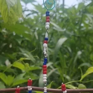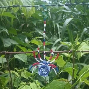 Decorative spider ornament with red, white, and blue beads. Features a blue rose centerpiece and a star charm. Great decor for your front porch. Designed and Handcrafted by me! 7" long. Thanks for stopping by and checking out. God bless ππΌβ€οΈ