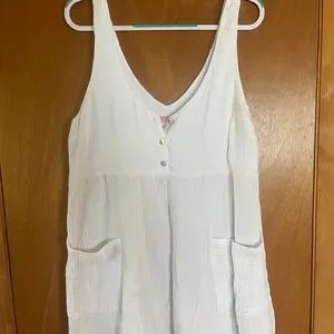 Elegant ivory cover up/ dress with button-down front. Lightweight and sleeveless design.