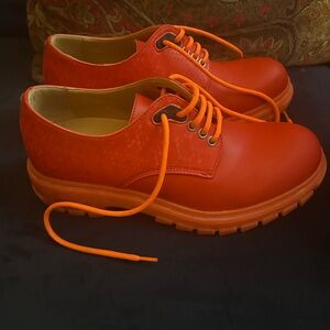 Bold orange Oxfords by John Fluevog. Eye-catching and stylish. Perfect for a standout look. In Excellent condition worn once and just don’t reach for them. They are very cool vegan vogs.