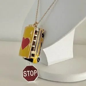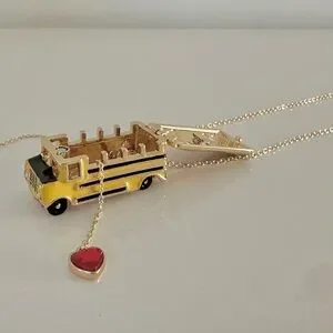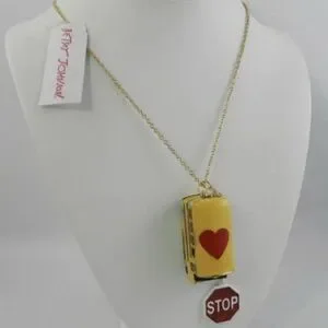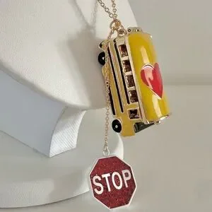 Betsey Johnson BACK TO SCHOOL Gold Tone Yellow Bus Heart Locket Long Necklace
