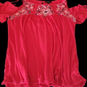 This vibrant red blouse features intricate embroidery, super soft material, feminine ties & cutouts for shoulders with a perfect pop of color. Ideal for casual occasions. B2