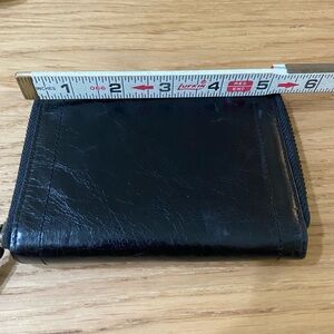 Sleek black leather wallet. Perfect for everyday use. Many slots for card and one slot for cash