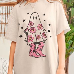 Oversized Fit T-Shirt with Retro Distressed Pink Flowers Ghost Wearing Cowboy Boots with star background.