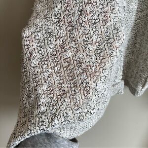 This cardigan is a looser knit making it slightly sheer. Has a ribbed knit sleeve and trim. Has a long draped front.