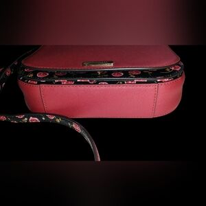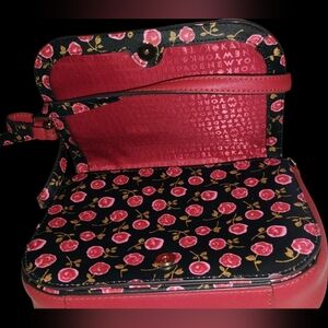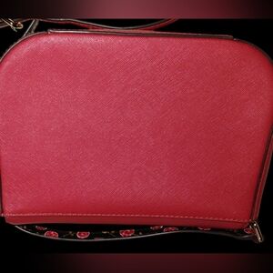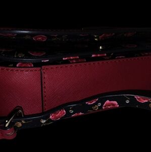 The striking red flower design is featured on the underside of the crossbody strap, on the trim of the cover and on the front of the body of the bag (as you can see in the pictures. This beautiful and unique bag is approximately 8 1/2" x 7" x 2". It has one zippered pocket on the interior back and a separate section from the main compartment on the front under the cover. This beauty has an adjustable crossbody strap that is approximately 47" in length. THIS BAG IS NEW WITHOUT TAGS AND HAS NO CALL OUTS! You will be sorry you missed out on this one.