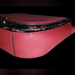 This stylish crossbody bag from Kate Spade features a vibrant red hue complemented by elegant floral accents, offering a perfect blend of modern design and timeless elegance. Its structured shape and metallic hardware add a sophisticated touch, making it an ideal accessory for any occasion.