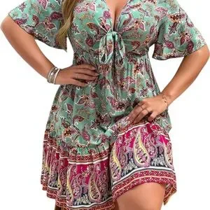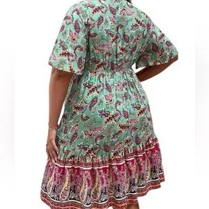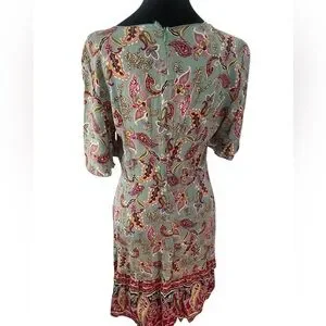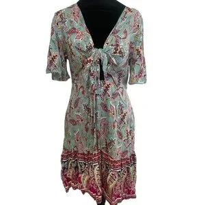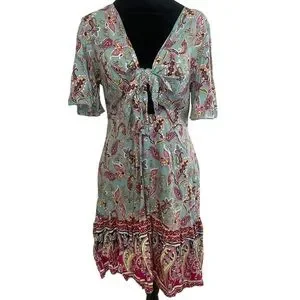 BohoTeal and Pink Paisley Tie-Front cut out Dress, Large, New