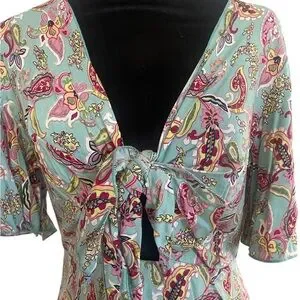 Chic dress featuring a vibrant paisley pattern. Teal and pink hues with a stylish tie-front design. New👗👠👛