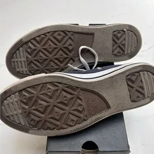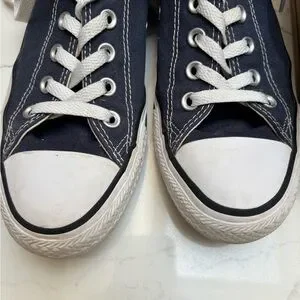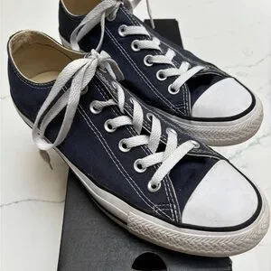 Navy sneakers with white accents. Iconic Converse style. Great for everyday wear.