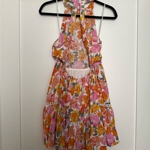 Vibrant floral halter dress. Features pink, orange, and yellow flowers. Perfect for a sunny day.