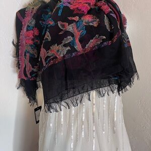 Elegant black scarf with vibrant floral embroidery. Features colorful flowers and leaves. Perfect for adding a touch of style.