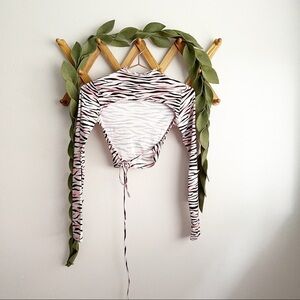 In excellent condition with no visible flaws or signs of wear. Pink, black, and white animal print high neck crop top with open tie back.
