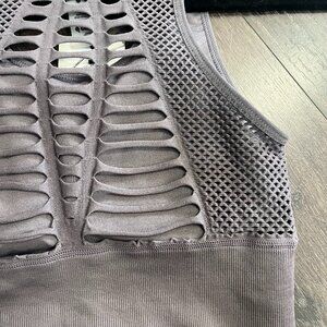 This unique sports bra is such a statement piece! It blends lattice-style mesh with laser-cut design on the front as back for a bold look. 92% nylon, 8% spandex. Seamless technology. Removable bra pads. Moisture wicking.