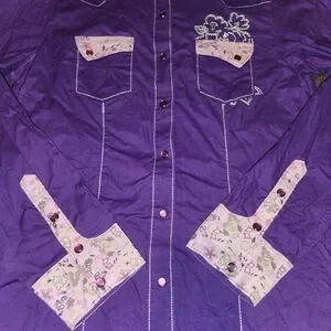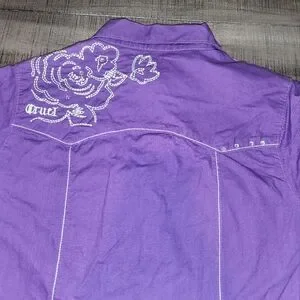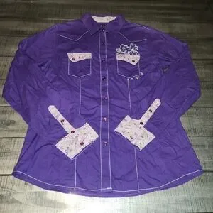 This vibrant purple woman's shirt features charming floral accents, perfect for adding a pop of color to any outfit. Crafted with care, it offers both style and comfort!