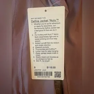 New with tags Lululemon Define Jacket Nulu. Light Purple. Lavender Lux. Size 8. Great for yoga, training, running, gym wear, athletic wear and casual wear. Rare to find. Sold out color and style. Guaranteed authentic.