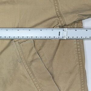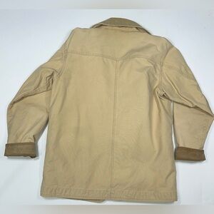 Vintage 90s LL Bean Barn Coat Size Small Petite Tan and Brown Rugged Distressed Chore Work Jacket with corduroy details, flannel lining, button closure, and pockets. Extra buttons included. Sold as is.