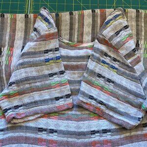 Beautiful Ace & Jig dress featuring the Spree textile from the Spring 2016 textiles. This is a double gauze with is prone to pulls. Considering its age and the fragility of the textile it is in very good condition. There are some minor pulls as to be expected with this textile. The photos are an accurate represenation of this the textile and the dress. It is a true medium with a bust ptp of 19'' and a length of 46 1/2''. Such a beautiful an unusual textile! I hope this dress finds a good home.